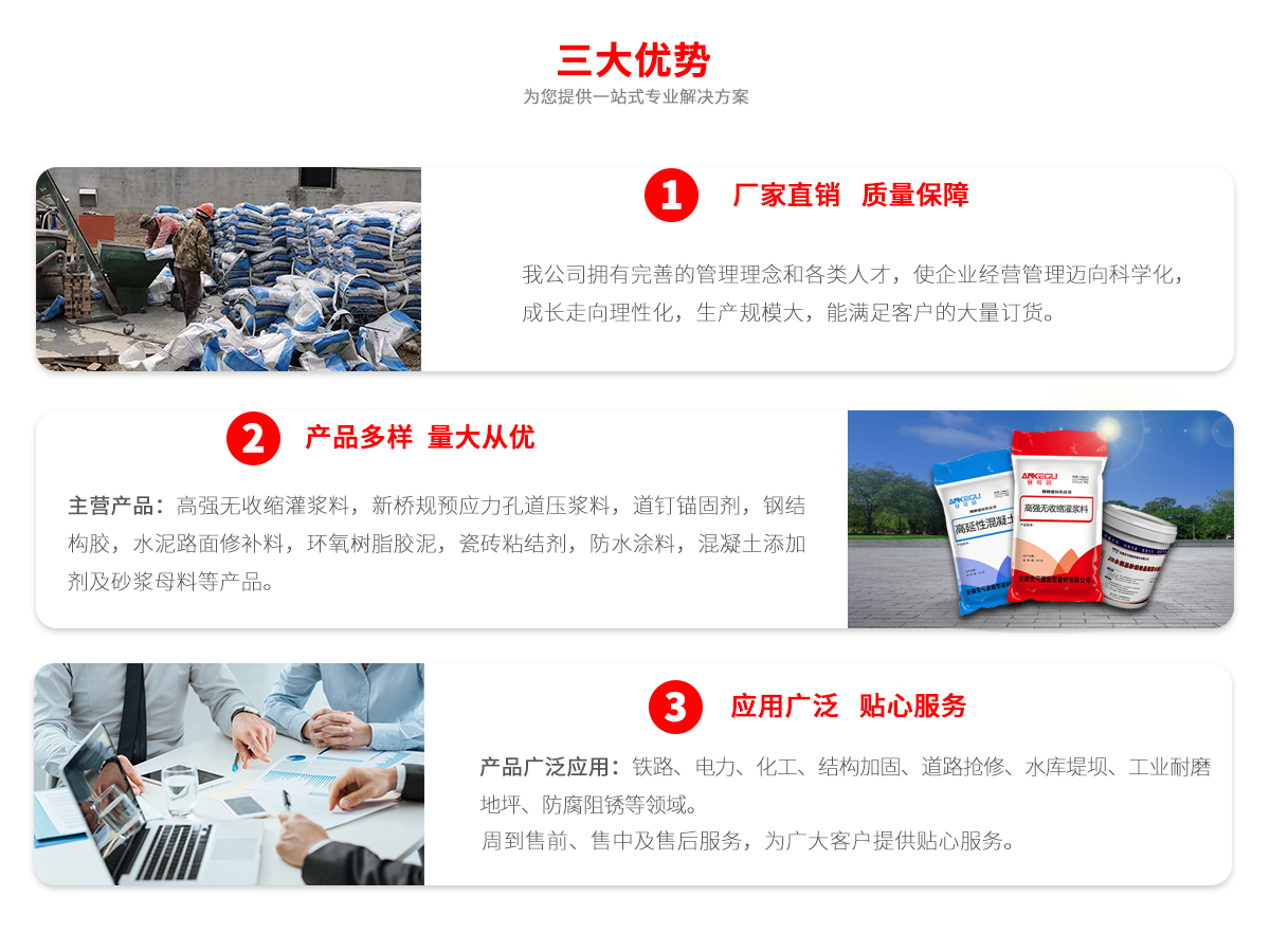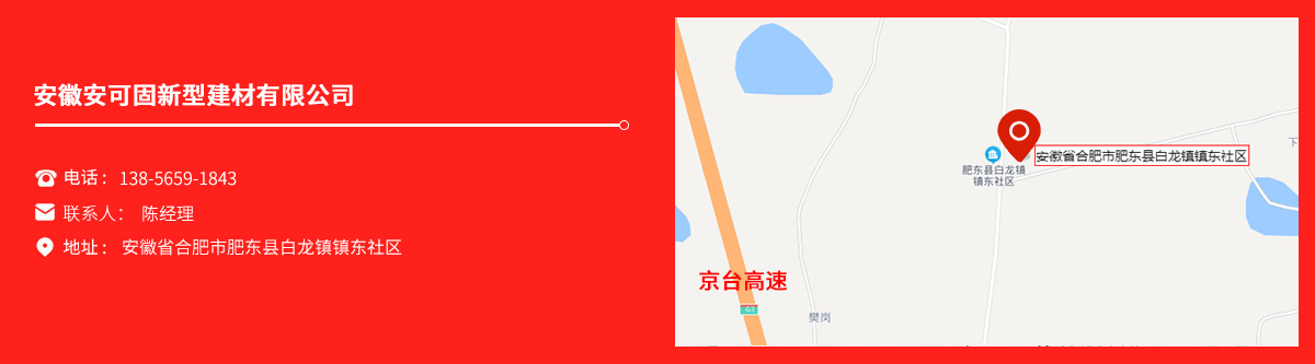 安徽安可固新型建材有限公司是一家集科研、生產(chǎn)、銷(xiāo)售與技術(shù)咨詢(xún)?yōu)橐惑w的特種建材企業(yè)。公司主營(yíng)產(chǎn)品:高強(qiáng)無(wú)收縮灌漿料,灌漿料,支座灌漿料,新橋規(guī)預(yù)應(yīng)力孔道壓漿料,道釘錨固劑,鋼結(jié)構(gòu)膠,水泥路面修補(bǔ)料,環(huán)氧樹(shù)脂膠泥,環(huán)氧灌漿料,瓷磚粘結(jié)劑,防水涂料、堵漏,混凝土添加劑及砂漿母料等產(chǎn)品。 安徽安可固新型建材有限公司產(chǎn)品廣泛應(yīng)用于鐵路、電力、化工、結(jié)構(gòu)加固、道路搶修、水庫(kù)堤壩、工業(yè)耐磨地坪、防腐阻銹等領(lǐng)域。...