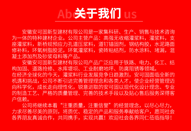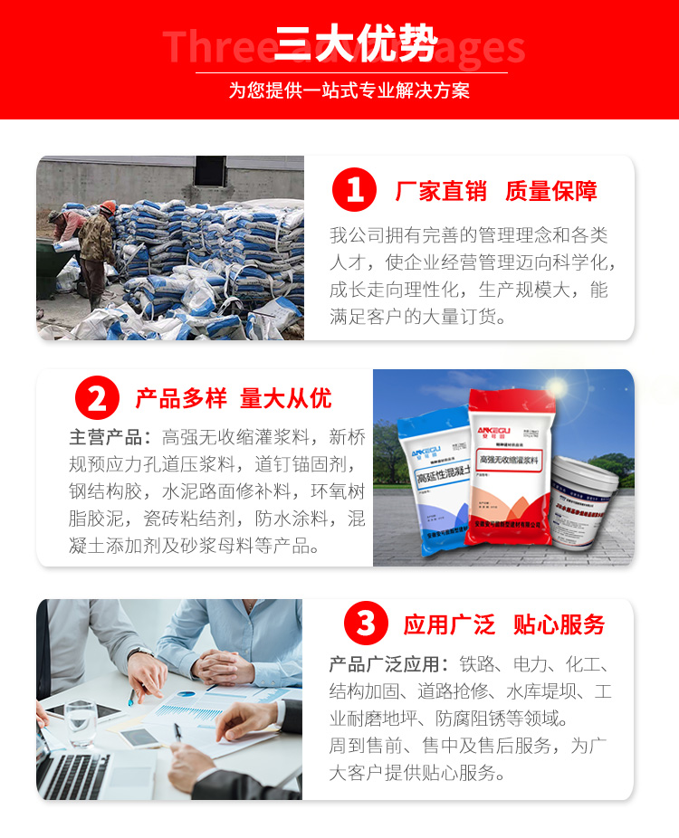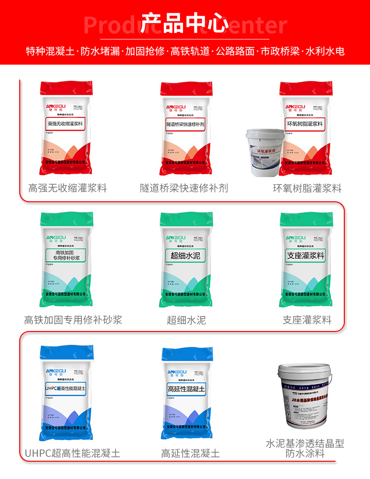 高強(qiáng)無收縮灌漿料,灌漿料,支座灌漿料,新橋規(guī)預(yù)應(yīng)力孔道壓漿料,道釘錨固劑,鋼結(jié)構(gòu)膠,水泥路面修補(bǔ)料,環(huán)氧樹脂膠泥,環(huán)氧灌漿料,瓷磚粘結(jié)劑,防水涂料、堵漏,混凝土添加劑及砂漿母料等產(chǎn)品。